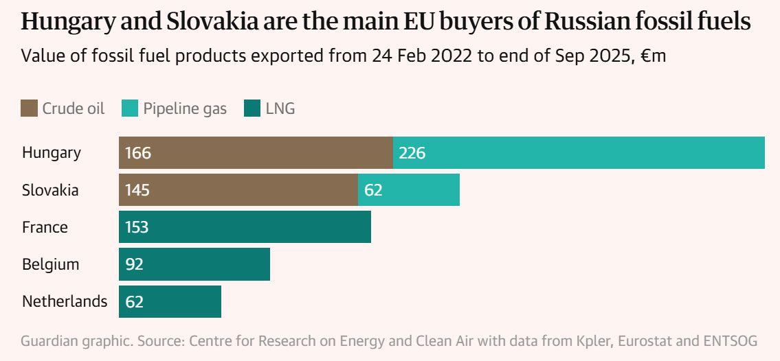 The Guardian подчеркивает, что лидерами закупок газа российского происхождения среди стран Евросоюза стали Венгрия, Словакия, Франция, Бельгия и Нидерланды.