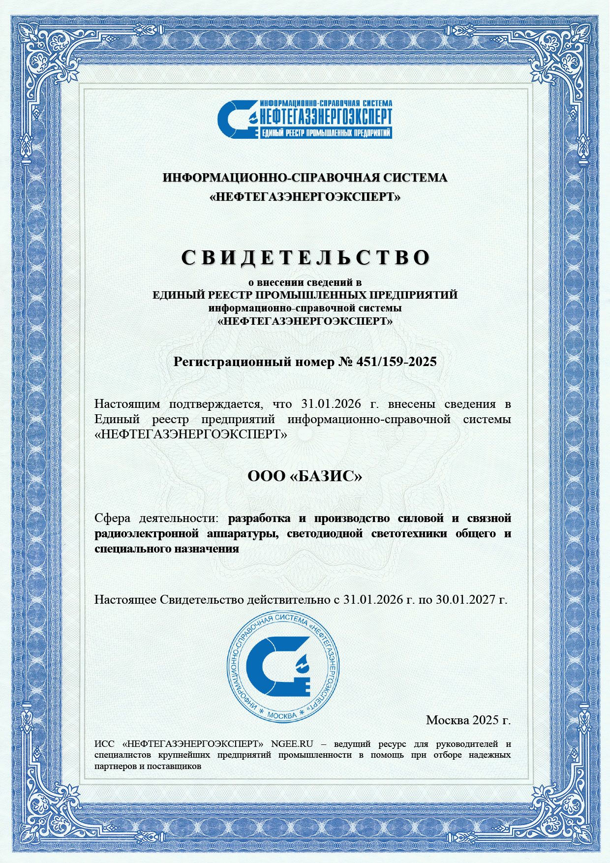 Свидетельство о внесении сведений в ЕДИНЫЙ РЕЕСТР ПРОМЫШЛЕННЫХ ПРЕДПРИЯТИЙ информационно-справочной системы «НЕФТЕГАЗЭНЕРГОЭКСПЕРТ» № 451/159-2025 до 30.01.2027; сфера деятельности: разработка и производство силовой и связной радиоэлектронной аппаратуры, светодиодной светотехники общего и специального назначения