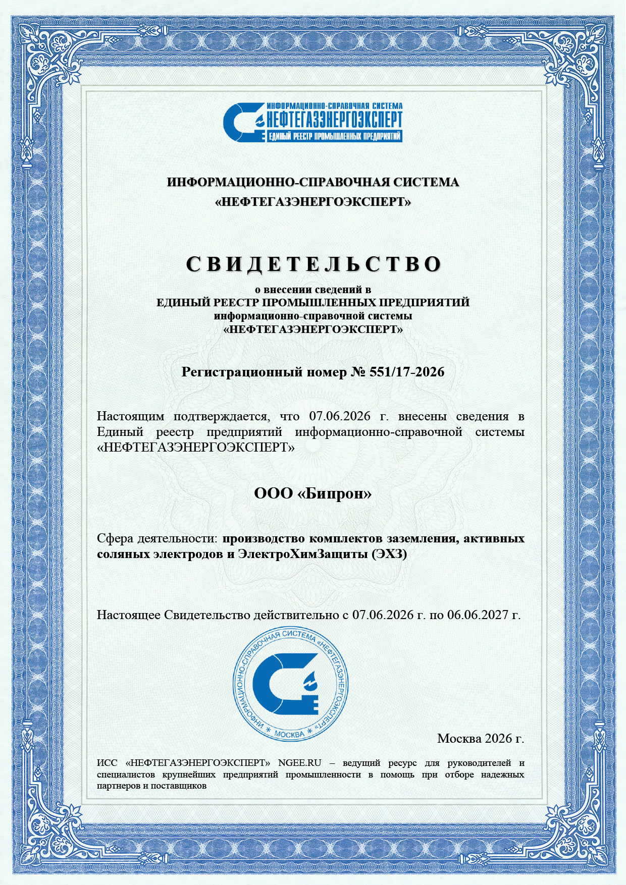 Свидетельство о внесении сведений в ЕДИНЫЙ РЕЕСТР ПРОМЫШЛЕННЫХ ПРЕДПРИЯТИЙ информационно-справочной системы «НЕФТЕГАЗЭНЕРГОЭКСПЕРТ» № 551/17-2026 до 06.06.2027 г.; сфера деятельности: производство комплектов заземления, активных соляных электродов и ЭлектроХимЗащиты (ЭХЗ)