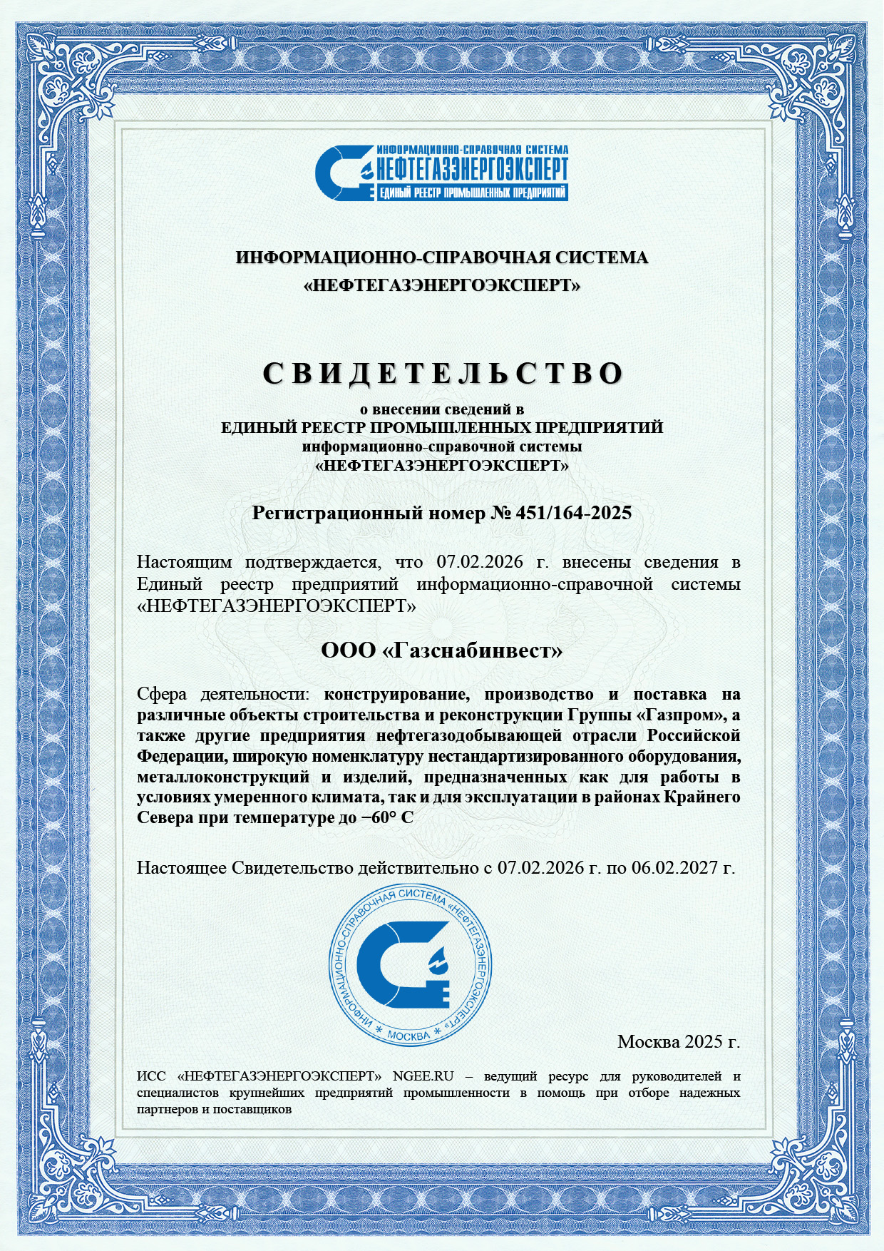 Свидетельство о внесении сведений в ЕДИНЫЙ РЕЕСТР ПРОМЫШЛЕННЫХ ПРЕДПРИЯТИЙ информационно-справочной системы «НЕФТЕГАЗЭНЕРГОЭКСПЕРТ» № 451/164-2025 до 06.02.2027; сфера деятельности: конструирование, производство и поставка на различные объекты строительства и реконструкции Группы «Газпром», а также другие предприятия нефтегазодобывающей отрасли Российской Федерации, широкую номенклатуру нестандартизированного оборудования, металлоконструкций и изделий, предназначенных как для работы в условиях умеренного климата, так и для эксплуатации в районах Крайнего Севера при температуре до −60° С