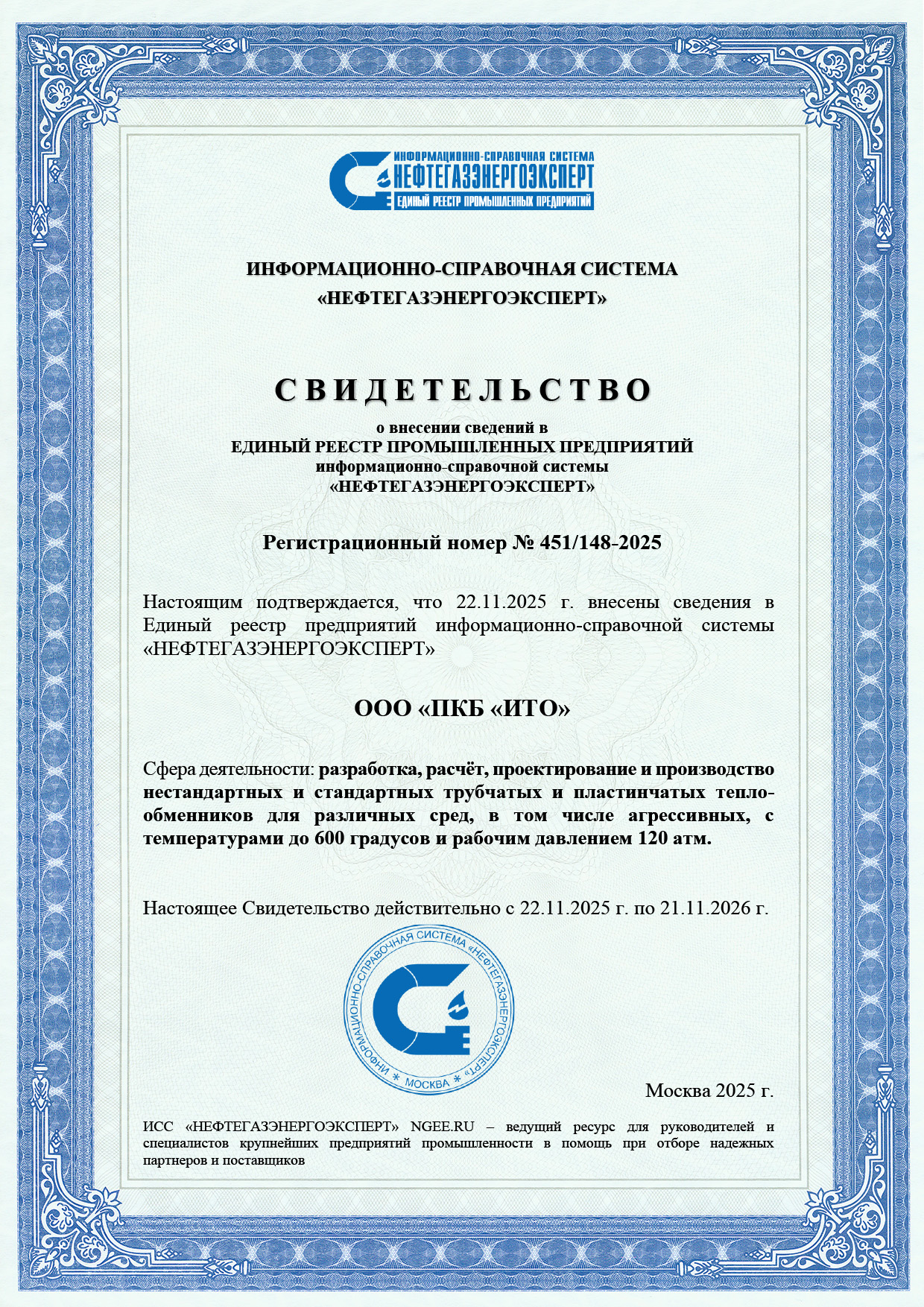 Свидетельство о внесении сведений в ЕДИНЫЙ РЕЕСТР ПРОМЫШЛЕННЫХ ПРЕДПРИЯТИЙ информационно-справочной системы «НЕФТЕГАЗЭНЕРГОЭКСПЕРТ» № 451/148-2025 до 21.11.2026; сфера деятельности: разработка, расчёт, проектирование и производство нестандартных и стандартных трубчатых и пластинчатых теплообменников для различных сред, в том числе агрессивных, с температурами до 600 градусов и рабочим давлением 120 атм.
