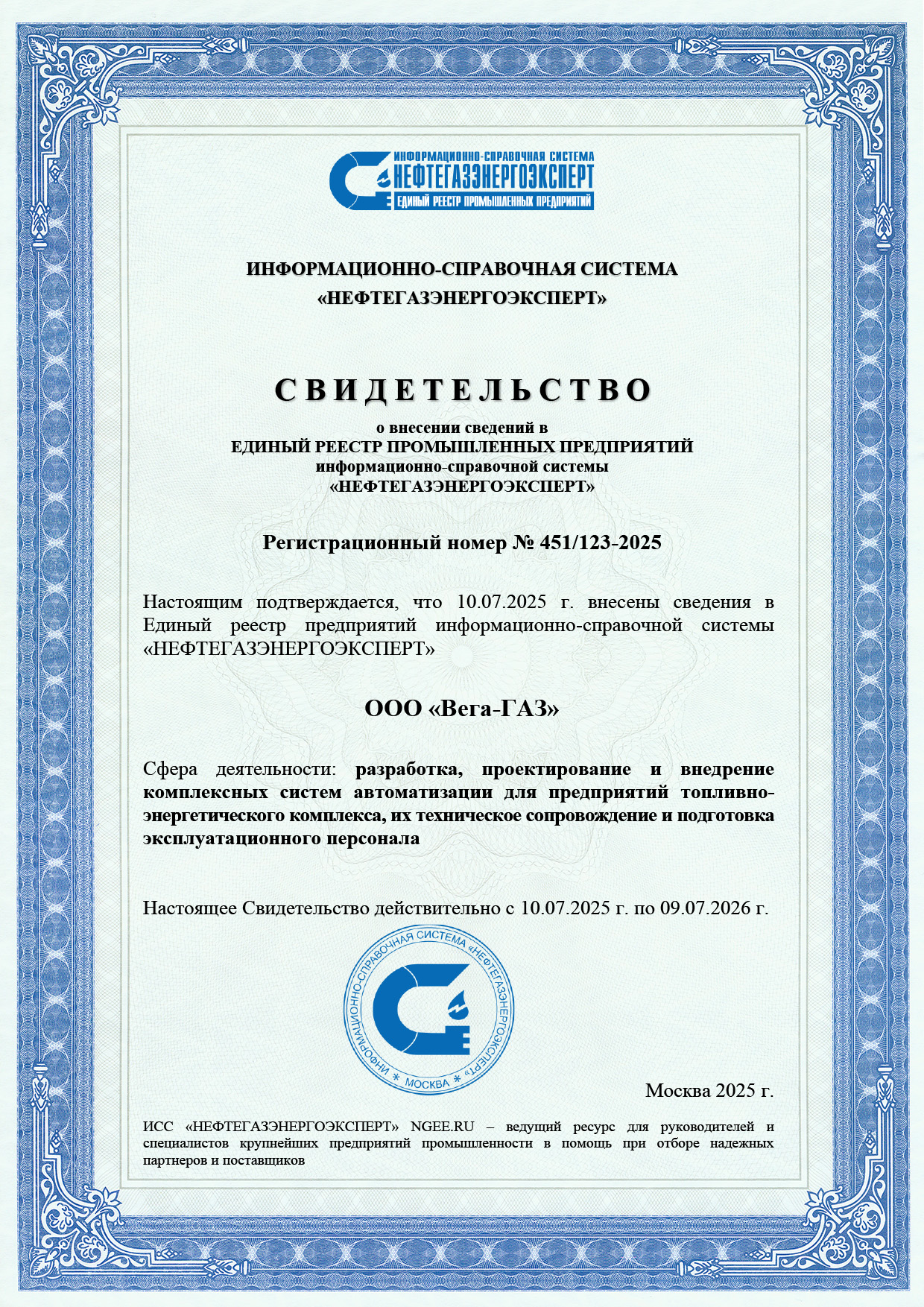 Свидетельство о внесении сведений в ЕДИНЫЙ РЕЕСТР ПРОМЫШЛЕННЫХ ПРЕДПРИЯТИЙ информационно-справочной системы «НЕФТЕГАЗЭНЕРГОЭКСПЕРТ» № 451/123-2025 до 09.07.2026 г.; сфера деятельности: разработка, проектирование и внедрение комплексных систем автоматизации для предприятий топливно-энергетического комплекса, их техническое сопровождение и подготовка эксплуатационного персонала