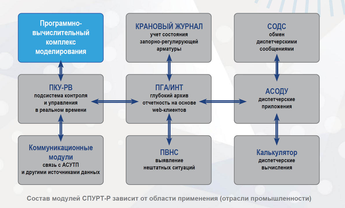 Подсистема выявления нестандартных ситуаций (ПВНС) предназначена для комплексного анализа значений технологических параметров на допустимость и непротиворечивость. ПВНС позволяет выявить неявные ошибки информационных обменов, технологических расчетов, отказы оборудования КИПиА на начальной стадии и, таким образом, повысить достоверность данных в системе. ПВНС использует информацию о текущих значениях технологических параметров из ПГА/ИНТ. Подсистема выявления нестандартных ситуаций может использоваться самостоятельно, при этом в качестве источника текущих значений параметров может выступать любая БД, имеющая ODBC-интерфейс. - АСОДУ — автоматизированная система оперативно-диспетчерского управления. Представляет собой полный набор функционала для решения задач диспетчерского управления газотранспортным предприятием путем: